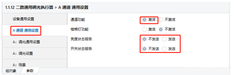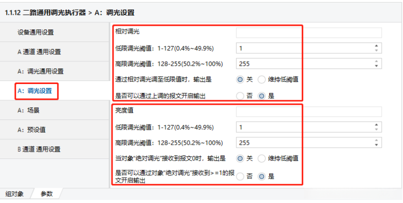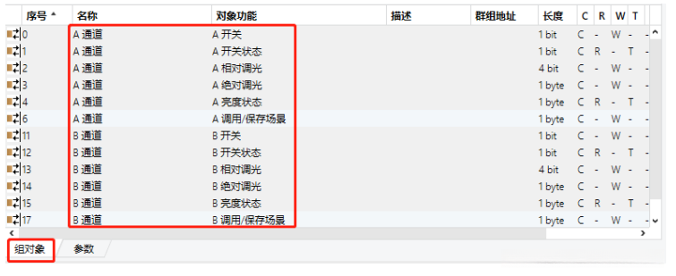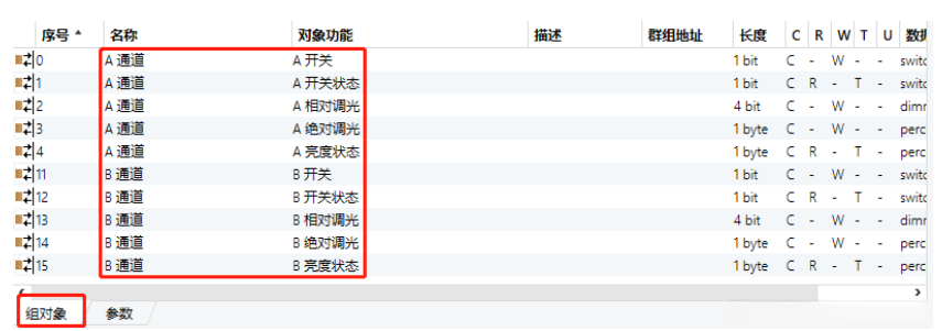 当2路调光模块都配置完成后,选择“参数”旁边的“组对象”就可以查看配置好的选项 “X 通道 - X 开关”、“X 通道 - X 开关状态 ”、“X 通道 - X 相对调光 ”、“X 通道 - X 绝对调光 ”、“X 通道 - X 亮度状态 ”等对象功能