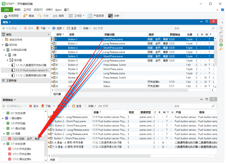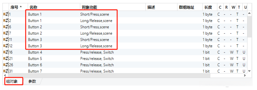 当8键智能触摸面板配置完成后,选择“参数”旁边的“组对象”就可以查看配置好的选项 “Button X – Short/Press , scene”、“Button X – Long/Press , scene” 等对象功 能。