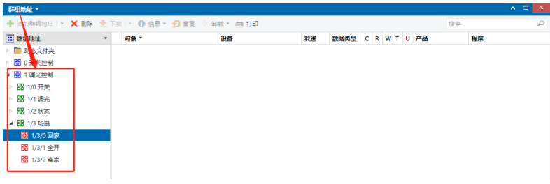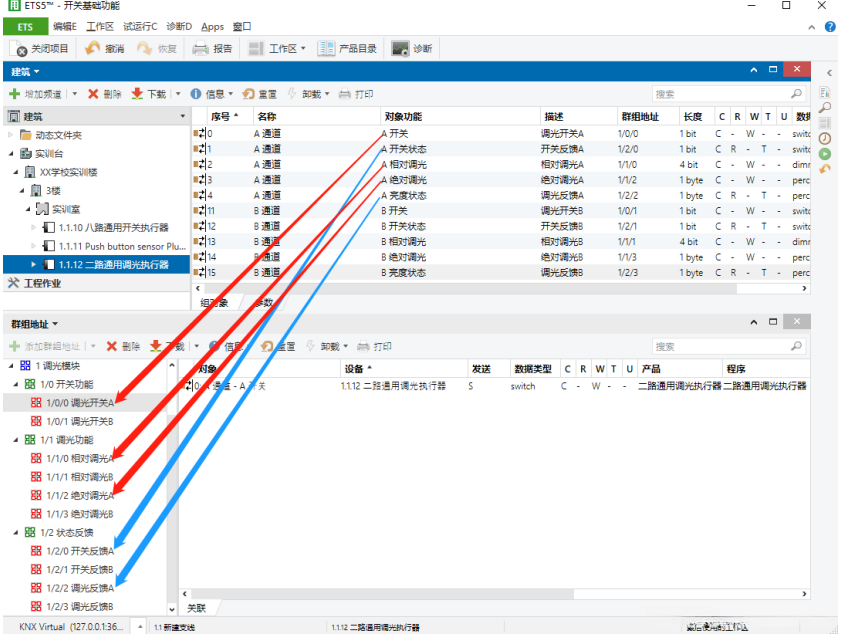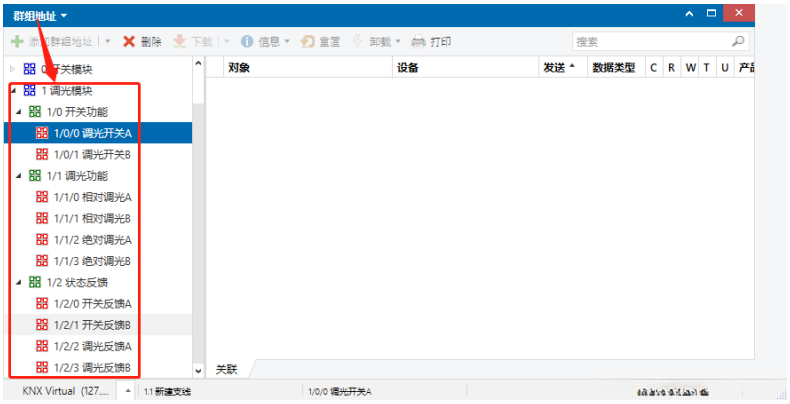 7.对应的组地址 选中2路调光模块通讯对象,将它拖到与之对应的群组地址中去。 2路调光模块组地址关联