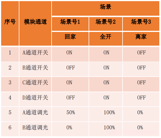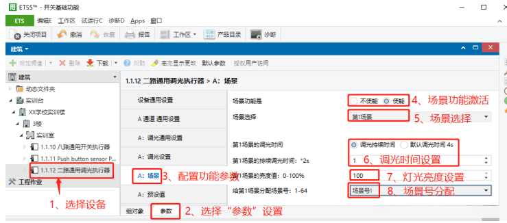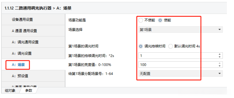2.配置2路调光模块与8键智能按键面板 2路调光模块 首先选择“2路调光模块”-》“参数”-》“X 场景” 参数设置界面“X: 场景”