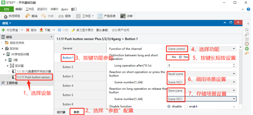 8键智能按键面板参数设置 8键智能按键面板控制2路调光模块场景功能参数设置,需要使用“Scene control”功能 (以Button 1 通道设置为例)