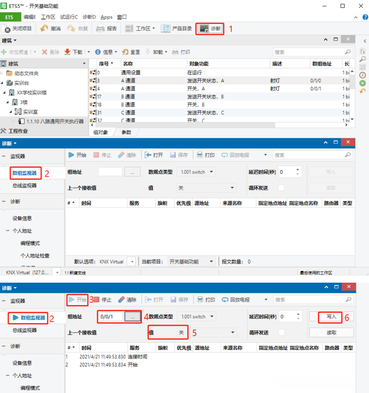 5.线上调试 点击快捷键上面 “诊断”,选择群组监视器→开始→选择组地址→开/关→写入