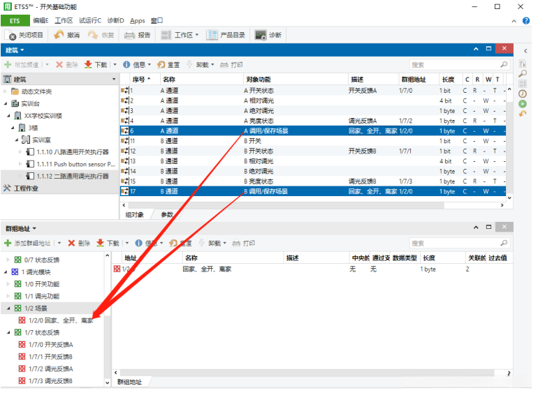 3.对应的组地址 选中2路调光模块与8键智能按键面板通讯对象,将它拖到与之对应的群组地址中去
