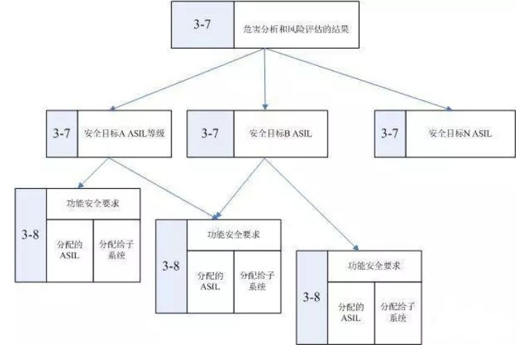安全目标和功能安全需求之间的关系是分层的,如下图所示。