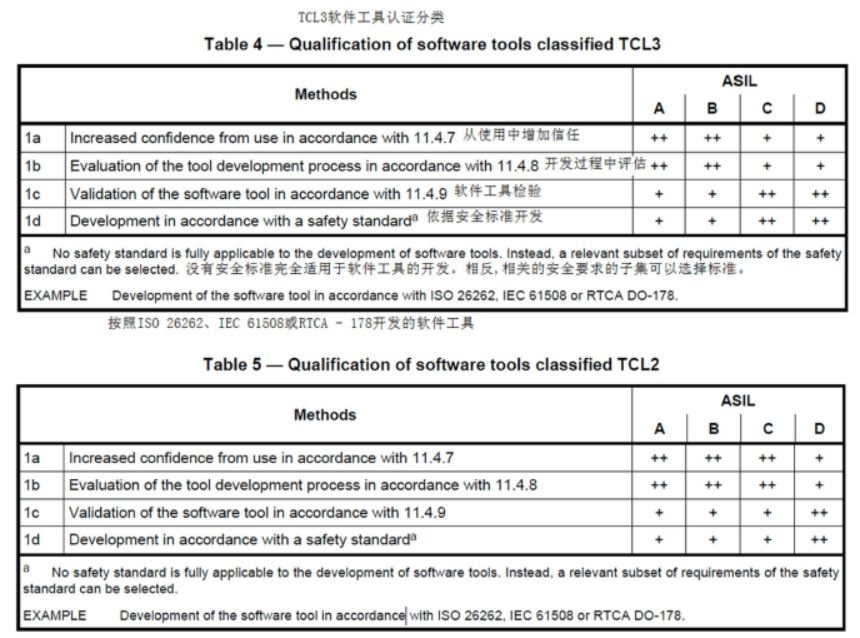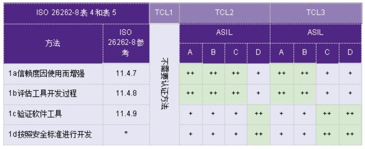 ISO 26262-8:2011详细列出了TCL3级工具认可的方法,在表5中则列出了TCL2级工具认可的方法。(如附图所示)
