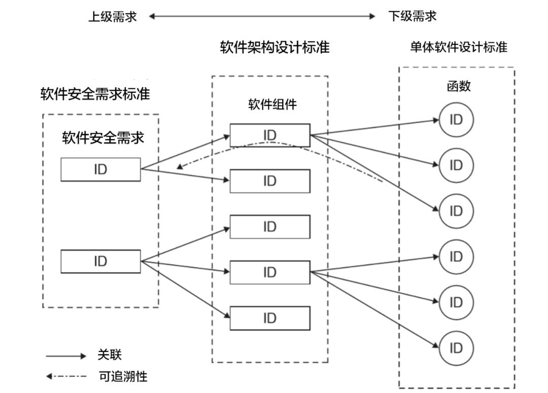 在软件开发中,ID号码对应于三个层面:软件安全需求(相当于功能设计)、软件组件和函数(如图所示)。通过这种方式可以明确阐述各层之间的关系,并通过验证与试验有效地发现上级要求下的下级需求缺失以及对函数不良影响的条件。