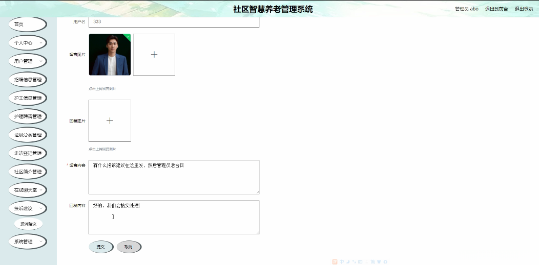 - 走访登记提交:社区工作人员或志愿者可提交走访登记信息,记录老年人的生活状况和需求。