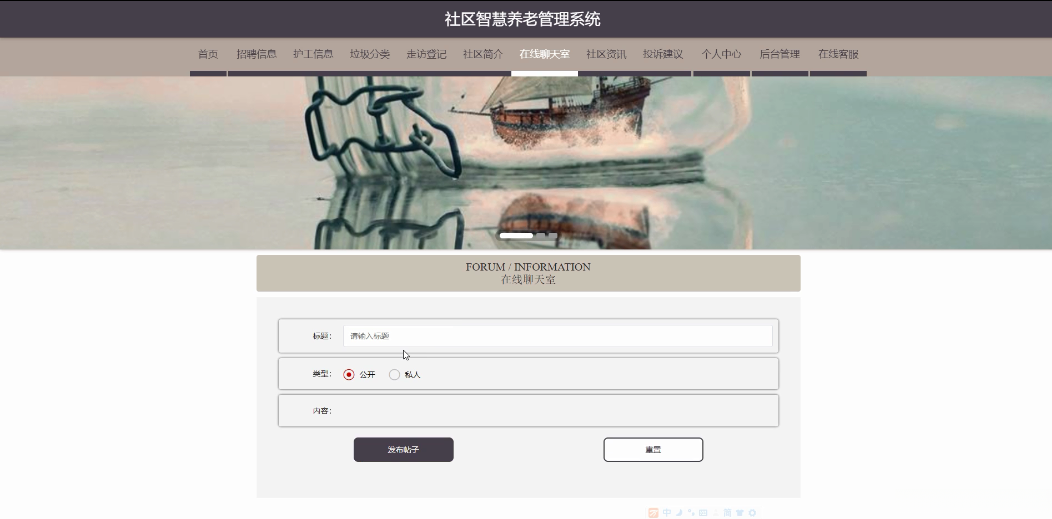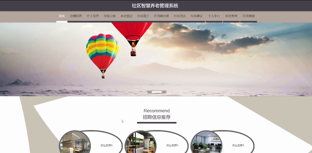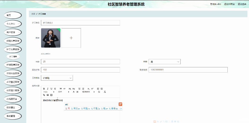 | 用户,招聘信息,护工信息,护理聘请,垃圾分类,走访登记,社区简介 |