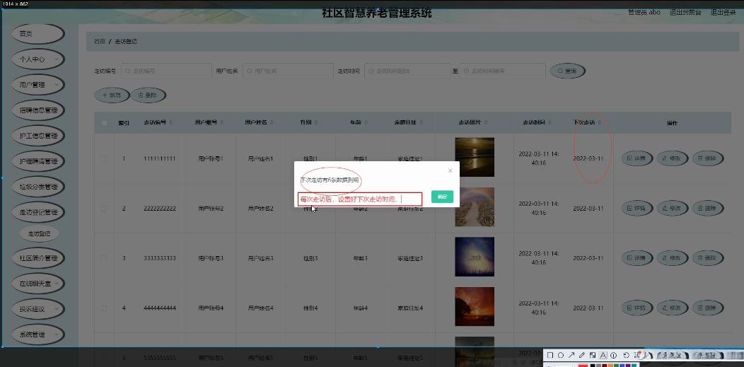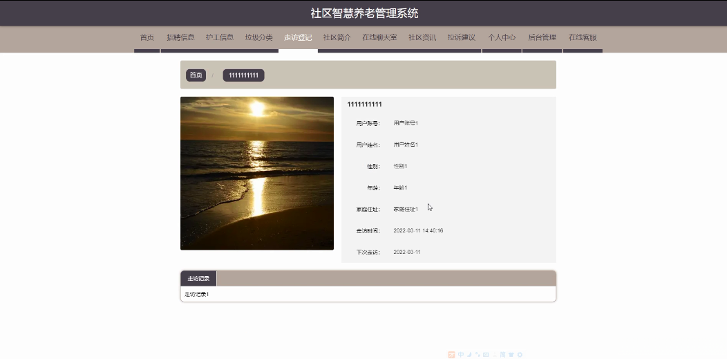 - 走访登记查看:用户可查看走访登记记录,了解老年人的最新动态。