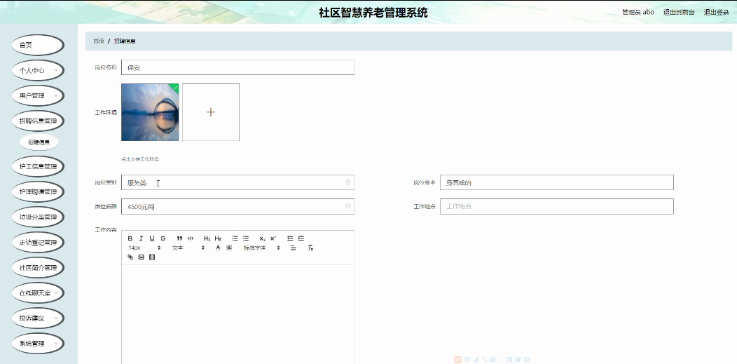 - 招聘信息发布:社区或养老机构通过系统发布招聘信息,包括职位、薪资、要求等。