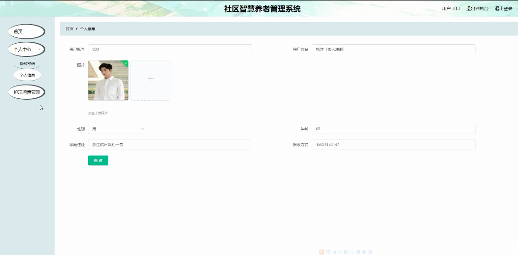 - 个人信息管理:用户可查看和修改个人信息,包括姓名、年龄、联系方式、健康状况等。