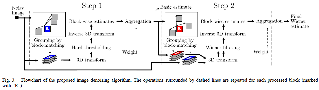 类似于非局部均值滤波器(non-local means filtering),该方法通过识别并匹配相似的小块区域来进行重构。具体而言,在实现过程中首先将每个待处理的图像划分为多个二维数据块,并将这些二维数据堆叠形成三维信号数据;然后利用三维正交字典对这些三维信号进行硬阈值或软阈值处理以达到降噪效果。
