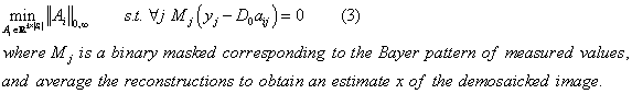 以D_2 = [D_0, D_1]替代式(3)中的D_0用于重构每一幅图像;随后利用式(2)的平均估计值来综合所有这些图像从而实现整个去马赛克的目标