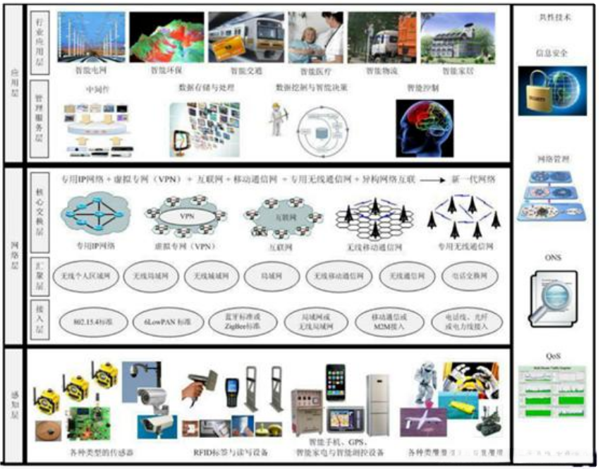 在物联网的概念定义中包含有三个关键部分:数据识别、通信网络和系统管理。通常情况下将物联网的体系结构划分为感知层、网络层和应用层三层体系。