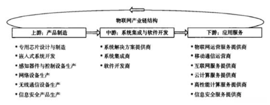 物联网产业能够构成一个完整的产业链体系,在其上游环节主要涉及产品制造,在中间环节则包括系统集成和软件开发,在下游环节则聚焦于提供应用服务。