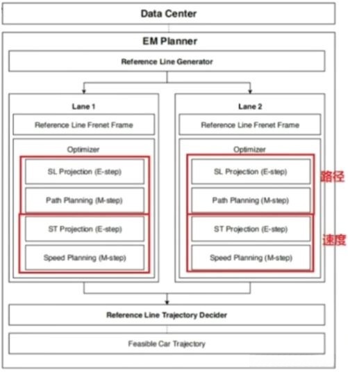 当可规划空间中有多条车道是时,需要使用EM算法对各车道分别规划,最后决策选用一个车道,示例如下: