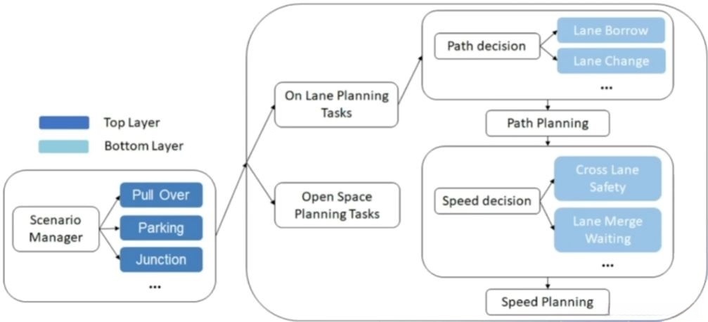 第一层是各种场景,场景的识别是Planning模块根据高精地图、感知、定位过来的信息综合判断出来的。