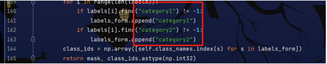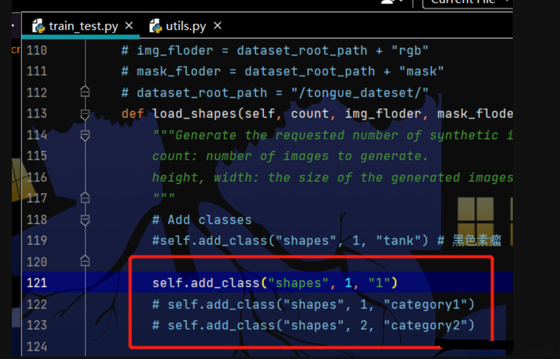 在train_test.py文件中修改第121行代码,在原有注释内容基础上进行更新或删除操作。具体来说就是根据类别数量相应地增加或替换相应的代码行内容。每个新添加的行中的第二个参数应设置为序号,并确保第三个参数对应正确的类别名称。