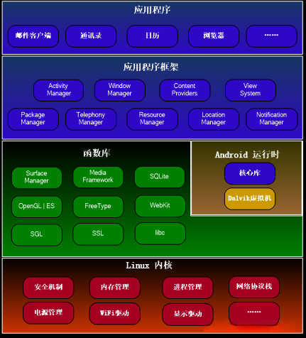 Android包含四个层次:底层是Linux内核, 接着是中间件层, 再是程序框架层和应用程序层.
