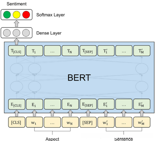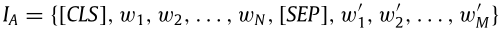 我们从一个方面{w1,w2,...,wN}和一个句子{w′1,w′2,...,w'M}出发,将它们通过特殊的标记'[SEP]''进行连接,并将一个特殊的标记'[CLS]''作为序列的起始部分。输入序列的表示方式如下: