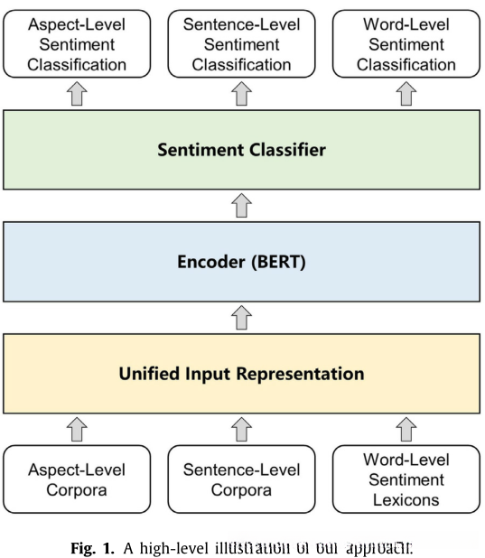 神经网络展现出的优秀性能得益于足够大的训练语料库。然而,在细粒度的情感分析领域,方面级的情感标注任务因其特别高昂的成本而显得尤为昂贵。因此,现有的方面级语料库规模相对较小。现有的方法通常仅依赖领域特定的方面级语料库进行模型训练,而训练语料库的匮乏严重制约了系统的性能。情绪分析系统可以从多域多粒度语料库的多任务学习中获益。作者提出了一种基于多源数据融合的体层情感分类方法。通过利用BERT(Transformers)[23]的双向编码器表示,生成了_方面特定_的句子表示,并用于_方面级别_的情感分类。作者设计了一个统一的框架,旨在整合来自方面级语料库、句子级语料库和词汇级情感词汇的数据。通过多任务学习框架,将模型应用于_体层、句子层和词层_的情感分类任务。通过采用多域语料库进行训练,并借助多源数据融合技术,系统能够从各种可用资源中学习更丰富、更广泛的情感知识。