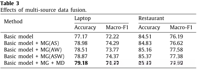模型在笔记本电脑和餐厅数据集上进行训练,其准确性分别高出2.97%、4.67%、3.44%和7.35%的水平,均显著优于最强基线。这一卓越表现主要得益于Data Fusion技术的优势,该技术通过整合多源数据,有效提升了模型的性能。Data Fusion不仅充分利用了多模态数据的互补性,还显著降低了噪声对模型性能的影响。此外,该方法还具备良好的扩展性,能够适应不同场景下的数据特点。