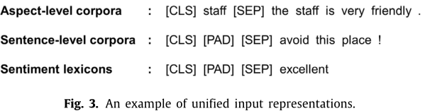 一个优秀的情绪分析系统旨在通过获取各种资源来存储情绪知识,以应对不同的情绪分析任务。我们将方面级情感分类任务设计为一个句对分类问题。由于情感词典和句子级词汇库缺乏为每个句提供特定方面词的能力,作者采用了特殊的填充标记'[pad]''来填补槽位。具体而言,对于情感词{w},输入序列表示如下: