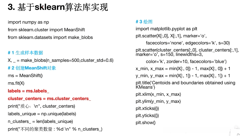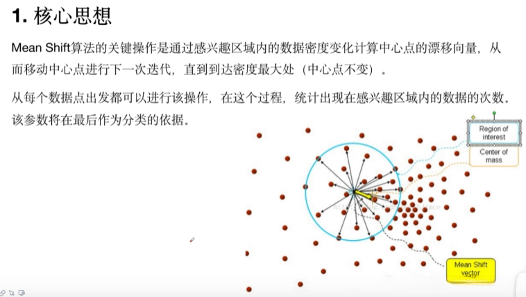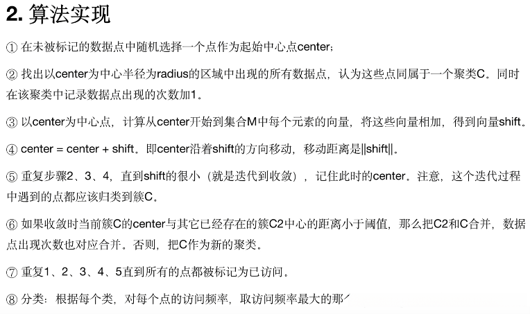 该算法基于密度计算。该算法包含一个称为半径的值。该算法需要计算一个漂移向量。在初始阶段,该算法也是随机选取的一个初始点。