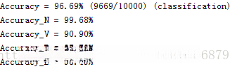 该部分主要基于分类器的实际预测输出(libsvmpredict在上一步骤生成的ptest向量),与预期的结果(标签)进行对比分析,并计算各分类的准确率等指标。完整的代码实现可参考作者提供的GitHub仓库。如前所述,在基于上述特征提取方法及参数配置的情况下,我们可以获得以下关于准确率的具体信息(由于每次运行时采用不同的训练集与测试集组合可能导致结果差异,请注意观察):