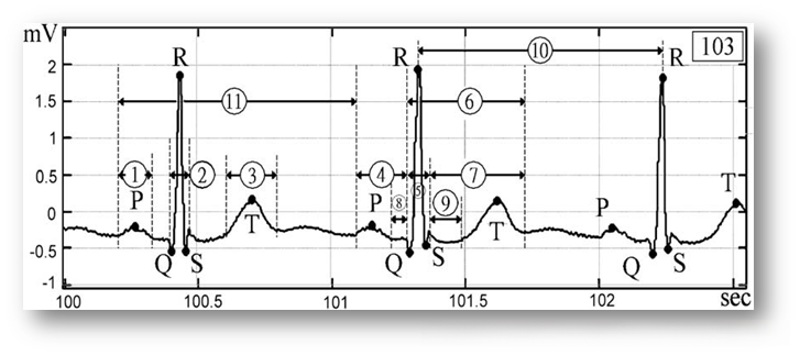 P 段高度、QRS 段高度、T 段高度、PR 隔度、QRS 隔度、QT 隔度、ST 隔度、PR 段宽度、ST 段宽度以及 RR 隔度如图所示