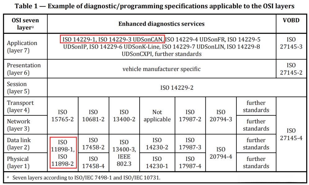 在开放系统互连(OSI)基本参考模型中规定了各类物理层通信对应部分的UDS诊断协议。例如,CAN通信(ISO 11898-1、ISO 11898-2和ISO 11898-3)在应用层的UDS诊断协议是ISO 14229-1和ISO 14229-3。