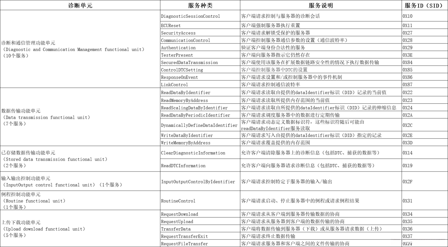 UDS诊断包括6大类,26种服务,每种服务都有自己独立的ID,即SID(Service Identifier)。