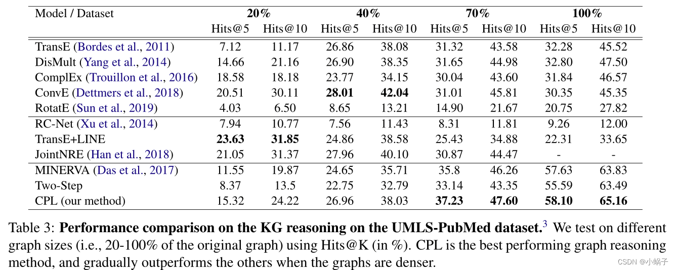 表3列出了KG推理在UMLS-PubMed数据集上的性能对比。我们采用了Hits@K(%)指标,在不同规模(即原始图尺寸为20%至100%)的情况下进行了测试。CPL表现最优,在图密度增加时其性能进一步提升。