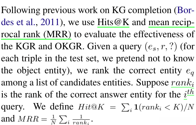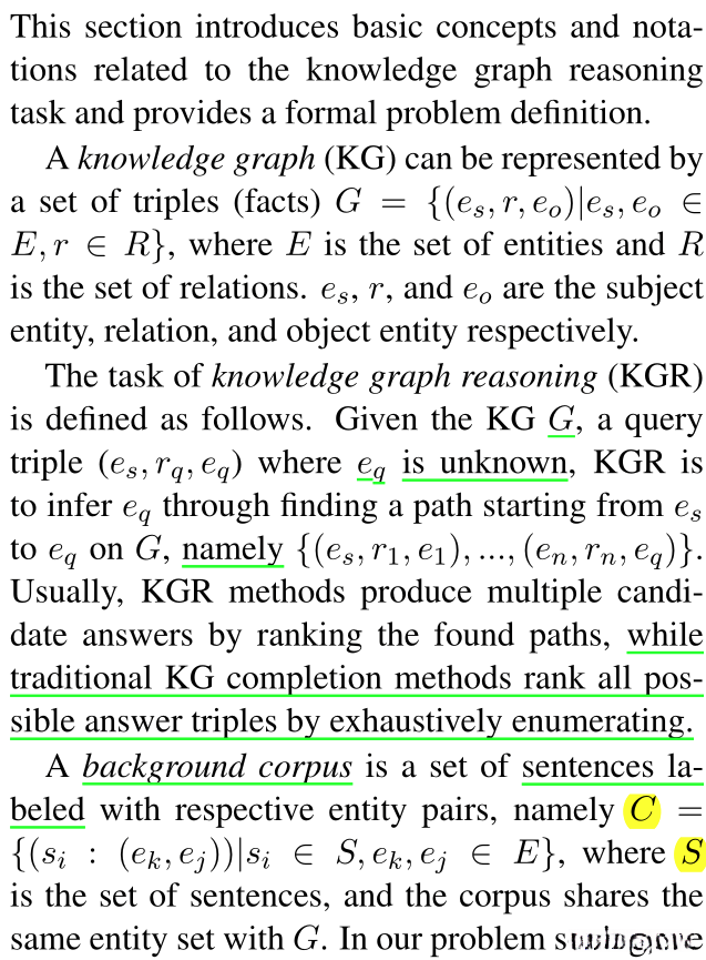 开放知识图谱推理(OKGR)旨在通过整合G与C来进行知识图谱推理活动,在此过程中,G通过从C中抽取的事实数据不断更新和完善自身。本研究重点考察了OKGR机制及其在实际应用中的表现特点。具体而言,则是利用语料库中的信息来增强知识图谱的能力,并持续补充相关的事实数据以丰富其内涵体系。鉴于此关于关系提取技术的具体评估超出了当前研究的探讨范围我们将这部分内容作为未来研究的重点来进行深入探讨。