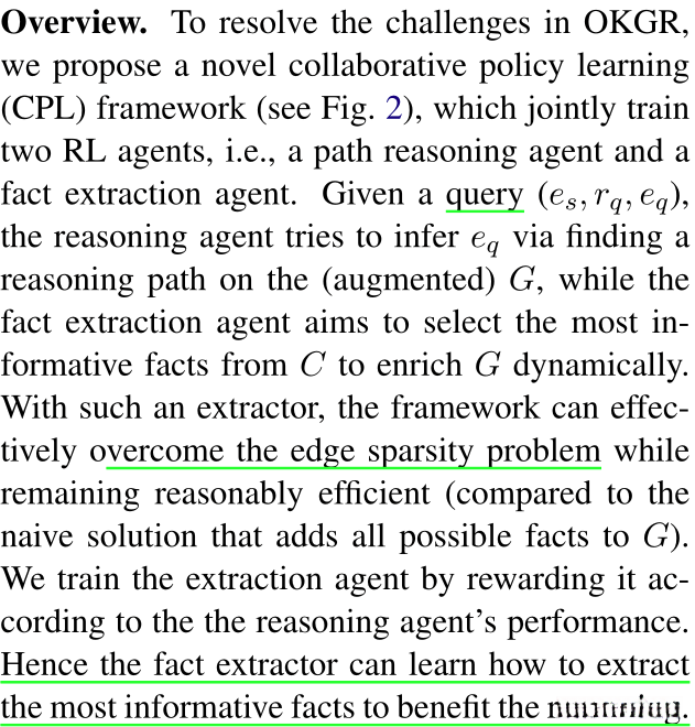 针对OKGR所面临的一系列挑战, 我们开发出了一种新的协作学习框架CPL, 该框架通过相互促进的方式协同训练两个强化学习代理. 在该框架下, 同时引入了一个专门负责信息提取的任务模块, 基于推理过程和语料库设计出一套基于现有知识快速识别关键信息的技术(见图2). 在具体实施过程中, 该任务模块会持续优化并动态调整图中权重最大的边, 从而使得强化学习代理能够更加高效地完成正向路径的探索.