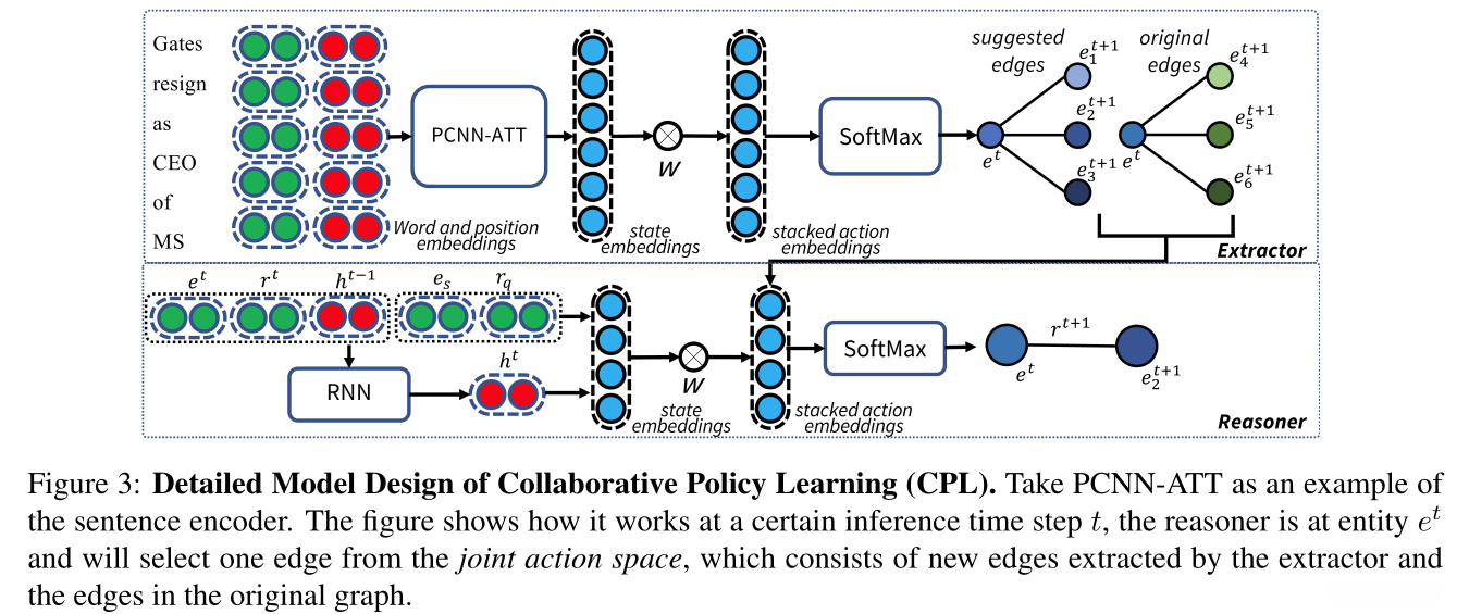 详细阐述协同政策学习(CPL)的具体架构。其中以PCNN-A TT为例展示了句子编码器的具体实现。在给定的推理步骤t中,在实体et位置上运行着一个高效的推理机制。该机制通过动作空间采样策略选取关联关系,在当前状态信息基础上进行状态转移操作。具体而言,在时间步t下,在实体et处运行时序网络结构会根据预设规则生成候选关系集合,并从中选择最优连接路径完成状态更新过程。