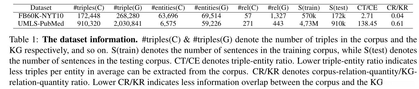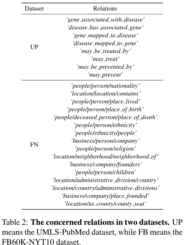 我们开发了两个数据集用于评估:FB60K-NYT101和UMLS-PubMed2。其中FB60K-NYT10数据集分别包含FB-60K知识图谱与NYT10语料库;而UMLS数据集则分别包含UMLS知识图谱与PubMed语料库。表1总结了两个数据集的统计信息。研究表明,在这两个数据集中关系分布存在明显差异性——对于某些特定的关系类型推理路径较为不足;此外还有些关系缺乏推理价值。基于此我们筛选出了一些具有推理价值且由领域专家推荐(见表2)的关系并确保其具备充足的推理路径随后相应地划分为了两个子图以展示不同规模对知识图谱大小的影响具体而言我们首先按照8:1:1的比例将整个知识图谱划分为三个互不重叠的部分即训练集验证集与测试集接着通过随机抽样的方法生成不同比例的sub-train-sets集合