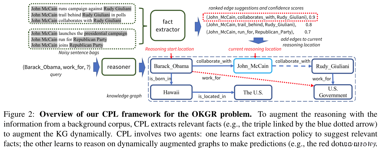 图2展示了基于OKGR问题的CPL框架概览。为了优化知识图谱(KG)的质量和推理能力,该方法通过抽取与蓝色虚线箭头相连的三元组信息来动态提升知识图谱(KG)的质量。该方法包含两大核心部分:第一部分是开发事实抽取策略并生成相关事实;第二部分是通过动态优化图结构来进行推理以提高预测准确性。