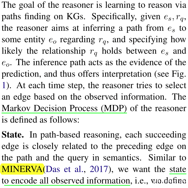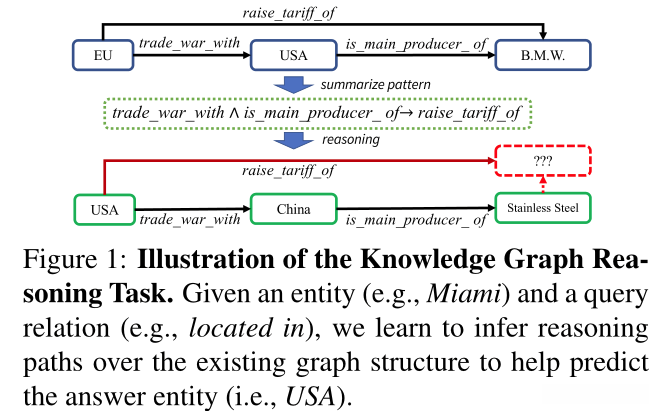 知识图谱的构建与推理过程,在人工智能领域具有重要意义。其中,在自然语言处理中,“识别图中缺失的事实(实体关系)的问题在该领域具有重要意义”。近年来提出的神经图推理方法如MINERV A (Das等人, 2017)、DeepPath (Xiong等人, 2017)以及Multi-Hop (Lin等人, 2018),在这一任务上取得了显著成果——其预测精度显著优于基于嵌入的方法(Trouillon等人, 2016;Dettmers等, 2018),并且模型具有良好的可解释性。这些方法将链接推理任务视为图上的路径搜索问题进行建模(例如,请参见附图)。