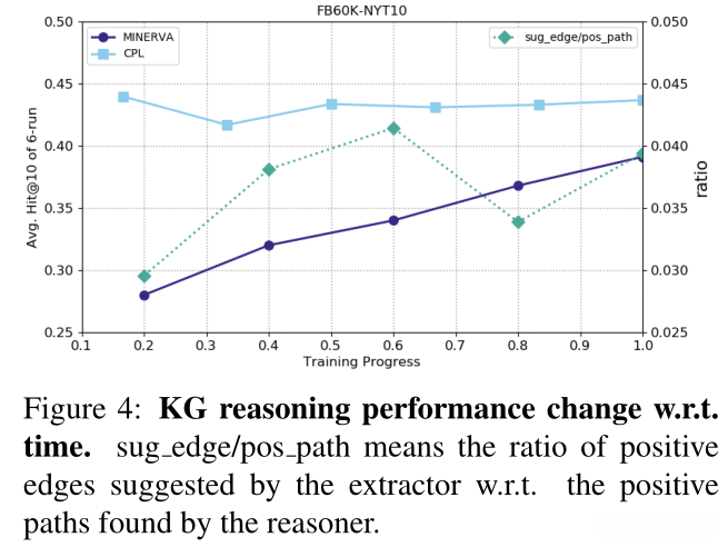 图4: KG推理性能的变化趋势与时间有关。sug edge/pos path路径是指提取器与推理器之间在正边缘与正路径之间的比值。