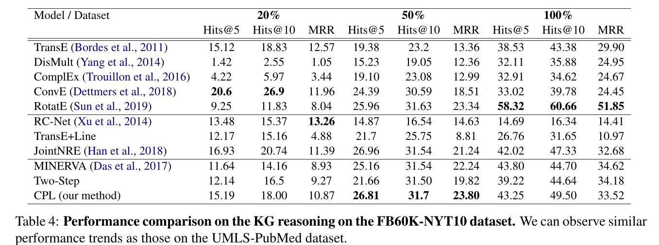 表4:在FB60K-NYT10数据集上进行知识图谱推理能力比较。通过分析该数据集的表现特征,我们能够清晰地看出其与UMLS-PubMed数据集在趋势特征上的相似性