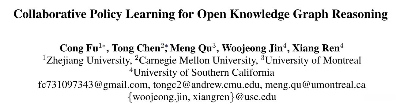 本研究致力于开发一种新型知识图谱推理方法,在现有知识库基础上实现新知识的有效提取以提升推理能力。为此我们构建了一个创新且通用性兼具的新框架即协作政策学习系统通过其协作训练两个协同代理分别是推理器与事实提取器让它们分别掌握路径推理策略以及相关事实提取规则该系统能够实现高效可解释性推理过程并有效去除噪声事实通过大量真实数据集测试展示了该系统的优越性能我们的研究方案具备灵活性支持多种寻径模块的改进方案例如可以通过引入ConvE或RotatE模型来进行奖励工程化处理从而随著相关组件的优化提升整体性能