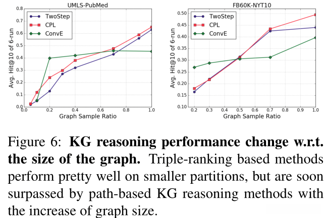 图6:与图形规模的关系。遵循三元组排序策略的方法在小规模区域中表现出色,在处理大规模数据时则逐渐被路径导向型的知识图谱推理方法超越。