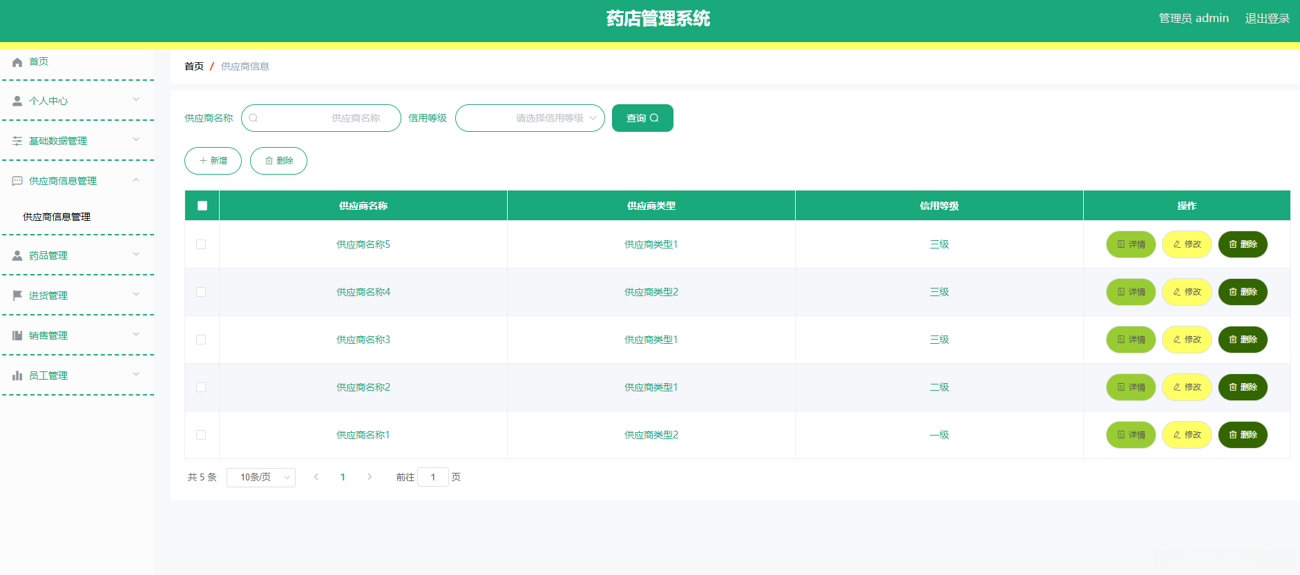 本药店管理系统分为管理员还有用户两个权限,管理员可以管理用户的基本信息内容,可以管理供应商信息以及供应商的租赁信息,能够与用户进行相互交流等操作,用户可以查看药品信息,可以查看供应商以及查看管理员回复信息等操作。