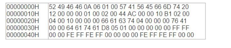RIFF文件的前4字节是其辨别码“RIFF”的ASCII字符编码,紧随其后的双字节数据则表示整个文件的大小(单位为字节,Byte)。由于表示文件长度或块长度的“数据大小”信息占用4Byte,因此,实际上,一个WAVE文件或文件中块的长度等于数据大小加8。
