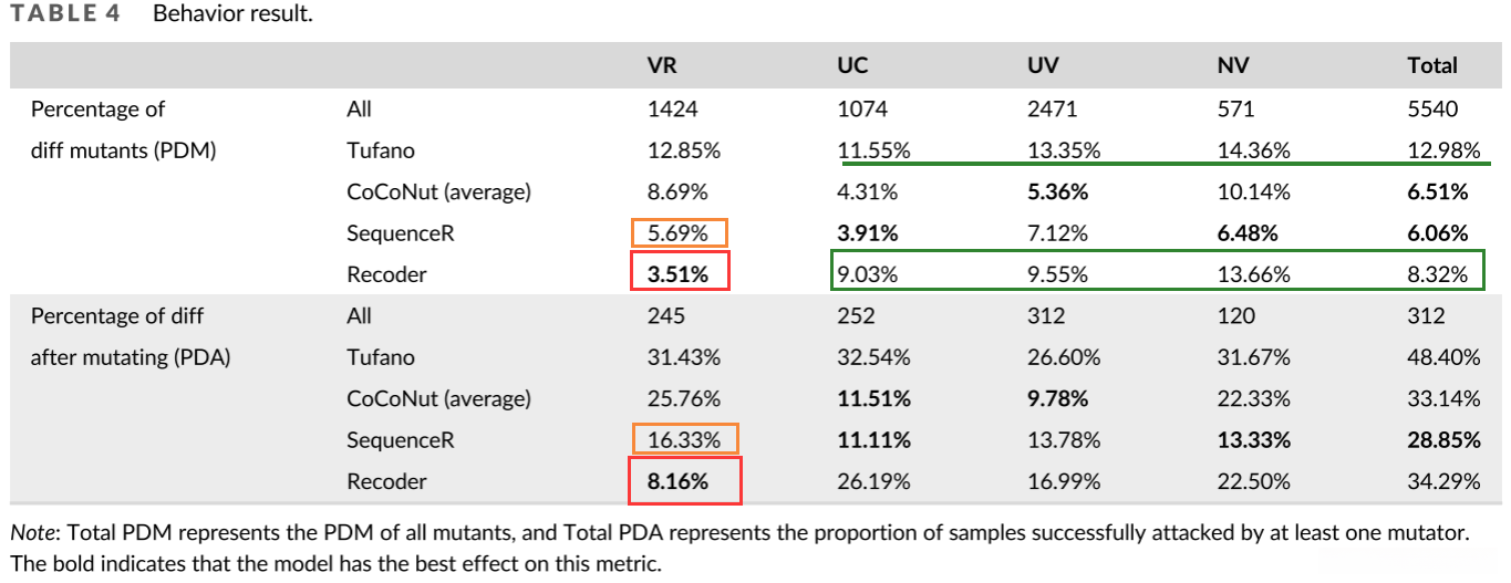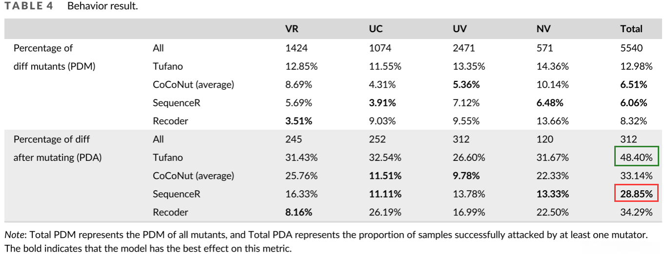 表4描述了行为实验的结果。在行为实验中,总体来说,各模型之间的性能差距较大,其中SequenceR的性能相对最好。然而,SequenceR的PDA仍接近30%。最差的模型是Tufano,它的PDA为48.40%,换句话说,Tufano近一半的输出是不可靠的。这表明,NPR对程序的语义理解和语义转换是脆弱的。在语义完全相同的突变下,NPR模型的语义理解能力受到严重挑战。