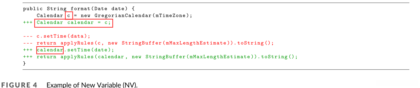 变量重命名(VR):选择方法中的变量或参数并对其进行重命名。Java中的大多数类名使用驼峰大小写或蛇形大小写来组合单词,新的名称将通过解析其类名来确定。我们使用三种常见的Java变量命名方法来获得新的变量名,它们是获取第一个单词的第一个字母,获取每个单词的第一个字母,并将类名的第一个字母更改为小写。例如,类SimpleName的变量将被命名为s,而sn将被命名为SimpleName。当然,新的变量名不应该在其作用域内使用。VR是评估代码相关任务的一种常见做法。