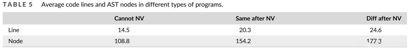 值得一提的是,NV和UV对语法树结构的变化程度相同,但NV对Recoder的影响要比UV高得多。在UV突变条件下,Recoder的PDM和PDA分别为9.55%和16.99%。在NV突变条件下,Recoder的PDM为13.66%,PDA为22.50%。后者明显高于前者。我们认为这可能与输入样本有关。UV (未使用的变量) 突变体对样品本身的要求很低。我们所有的样品都可以被UV突变,而只有120个样品(约38%)可以被NV (新变量) 突变。这是因为NV需要在Sample方法中声明一个局部变量,并且存在对该变量的引用。许多方法都不符合条件。因此,可以用于NV的样本本身就更加复杂。如表5所示,我们做了一个统计,NV可以变异的样本在AST的代码行数和节点数上远远高于其他样本,NV之后的DIFF部分更高。