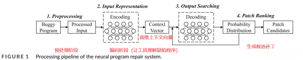 NPR系统如何生成补丁的整个过程如图1所示。如先前研究总结的那样,该过程可分为四个阶段。首先,在预处理阶段,需要将缺陷程序处理成神经网络可以接受的形式。该形式取决于神经模块的体系结构(例如,SequenceR中的顺序代码tokens)。然后,在编码阶段,编码器接收处理后的输入,并将其编码成高维上下文向量。这个阶段的目标是让工具理解缺陷程序。最后,在补丁排序阶段,解码器分多步生成候选补丁。在每个步骤,解码器计算token词汇上的概率分布,并输出按概率排序的token。解码器不断地生成token,直到到达结束符号。