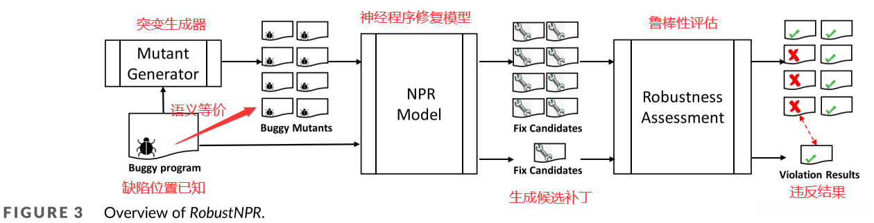 鲁棒性:我们将NPR工具的鲁棒性定义为在语义相同的对抗突变下保持输出语义相同的能力。例如,如果我们有一个缺陷程序P和它的语义相同的突变体Pt,我们将它们送入相同的NPR模型并得到输出。两个输出的语义应该相同。